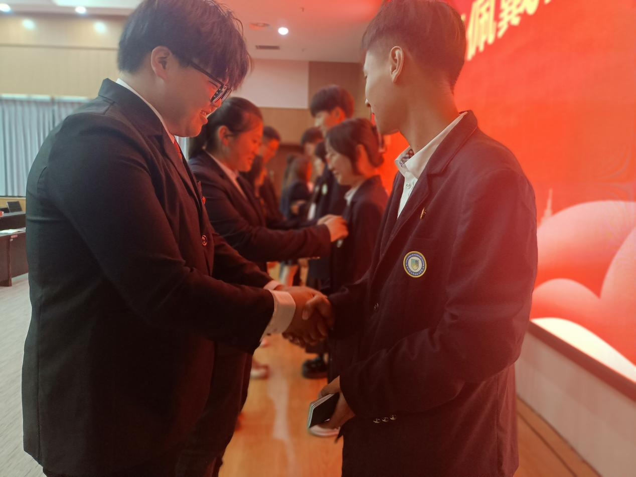 老团员代表为新团员代表佩戴团徽并颁发团员证。