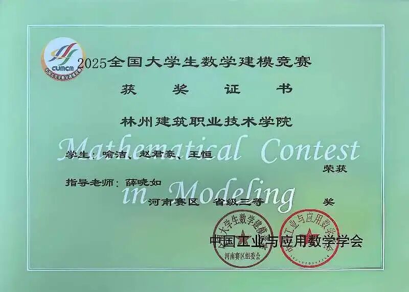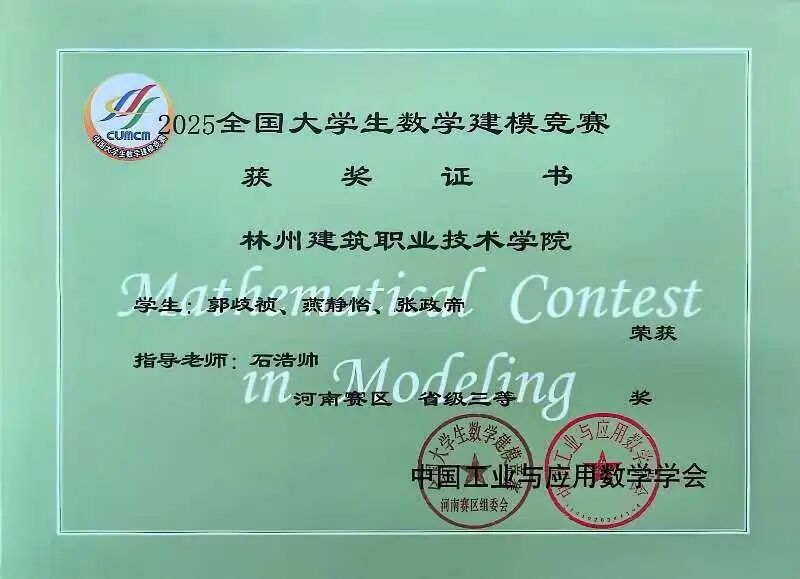 近日,2025年全国大学生数学建模竞赛成绩揭晓,太阳成集团tyc33455cc(以下简称“林州建院”)学子在此项被誉为中国高校规模最大的基础性学科竞赛中取得历史性突破,选派4支参赛团队,一举斩获国家级二等奖1项、省级二等奖1项、省级三等奖2项的优异成绩。这一佳绩不仅彰显了学子们的学习研究精神,更是学校深化教学改革、注重应用型人才培养的生动体现。