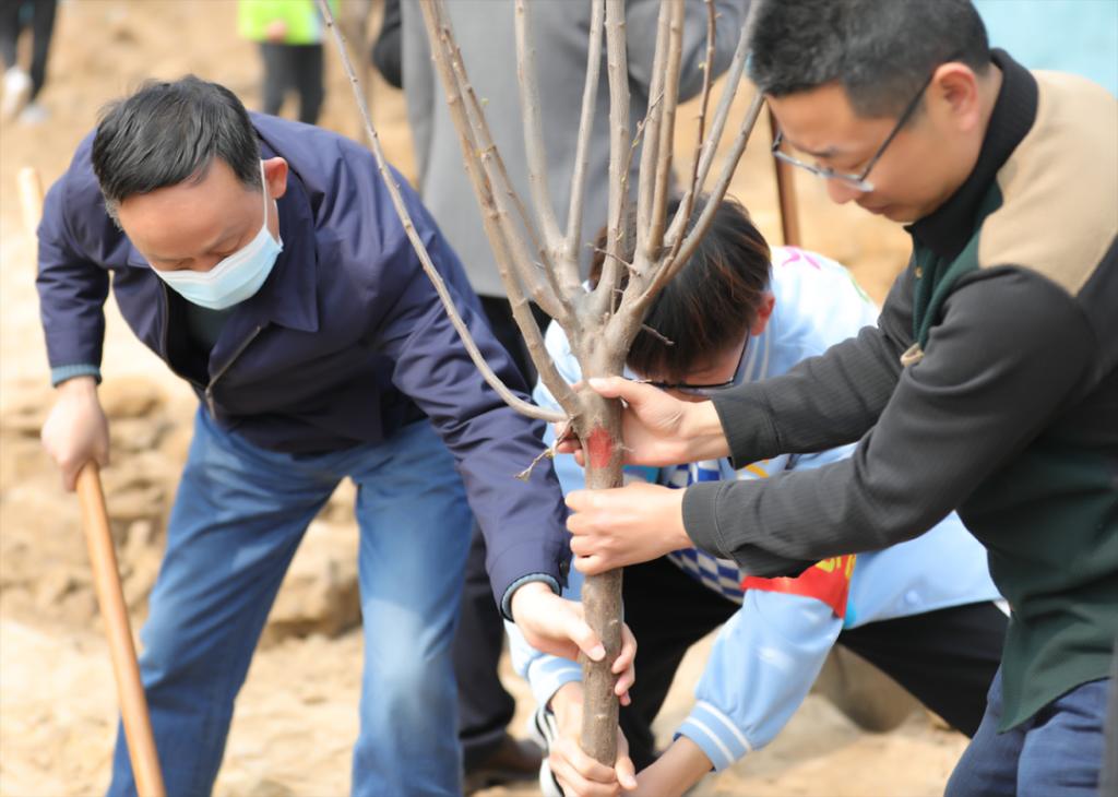 校领导班子成员带领志愿者们拿起铁锹,在指定位置种植树苗。大家分工明确,干劲十足,相互协作,完成了挖坑、插苗、填土等一系列操作。将一棵棵充满生机和希望的树苗,植入小坑之内,同时也把满满的希望和爱心载入土壤之中。