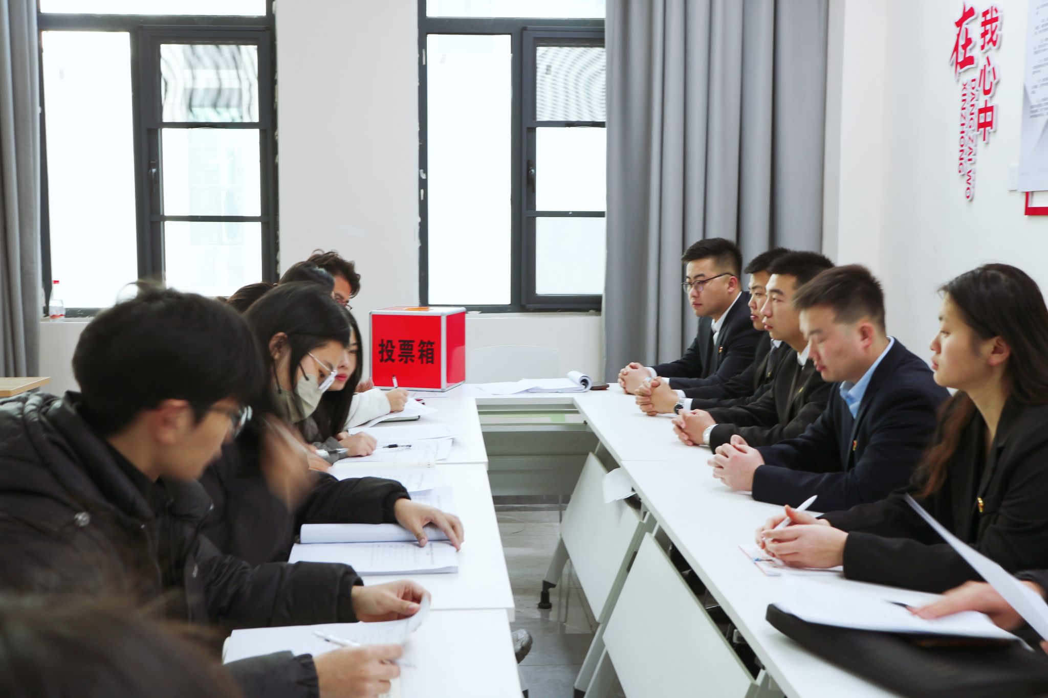 会议伊始,张杰同志明确大会主题,朱淑华同志详细汇报了此前党内外群众座谈会的意见及民主评议结果,全体参会党员对六名同志的表现给予高度评价。随后,支部大会进入讨论环节,与会党员结合日常观察,围绕六名同志的思想觉悟、工作能力、群众基础等方面补充发言,一致认为他们始终以党员标准严格要求自己,思想上进、作风扎实、乐于奉献,完全符合中共正式党员标准。经全体正式党员无记名投票表决,一致同意朱鸿艺、王运平、吴祎涵、姚杰、申明鑫、桑梓鑫六名同志按期转为中共正式党员。