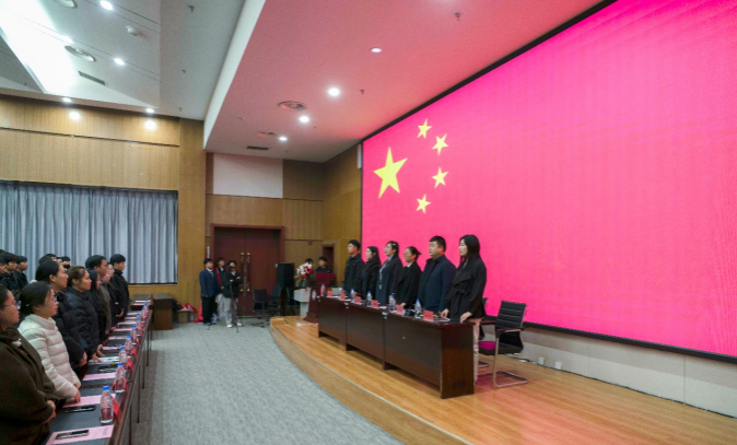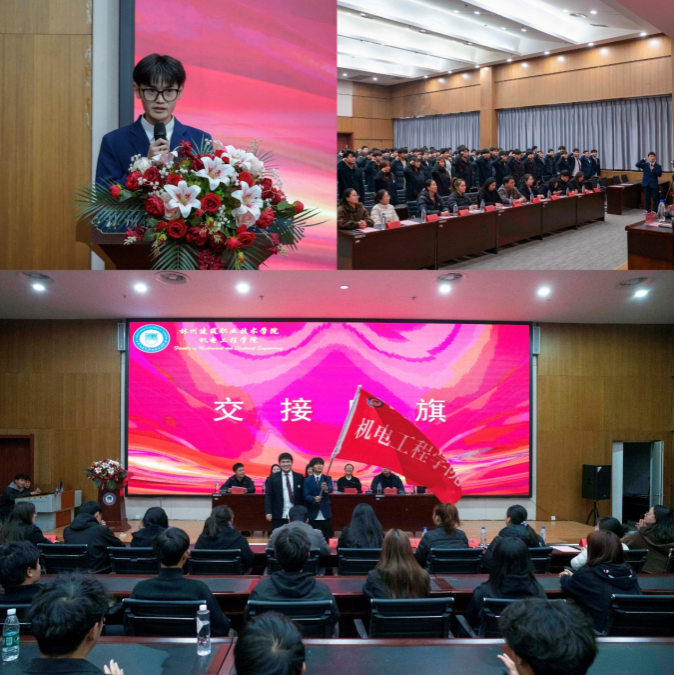 随后,机电工程学院学生副书记郭兆艺作为第二届学生会干部代表发言,表达了新一届学生干部服务同学的决心与信心。在庄重的气氛中,23级学生会代表将机电工程学院院旗郑重移交至24级学生会代表手中,象征着学生组织工作的接力与学生精神的传承。在学生会主席李梦想的带领下,第二届学生骨干及各班班委进行了庄严宣誓,承诺将恪尽职守,全心全意为同学服务。